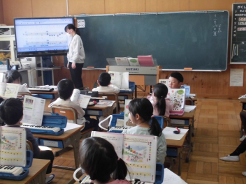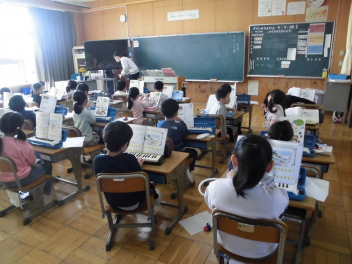 •  1年生が、けん盤ハーモニカを上手に演奏していました。みんな、とてもいい表情で歌ったり演奏したりしていました。
