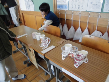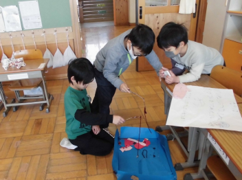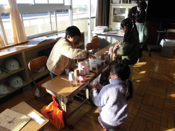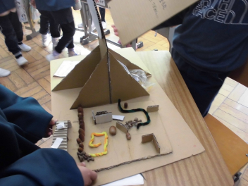 •  1年生は、生活科の学習で集めた木の実や葉をつかって、楽しいおもちゃを作りました。