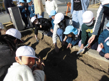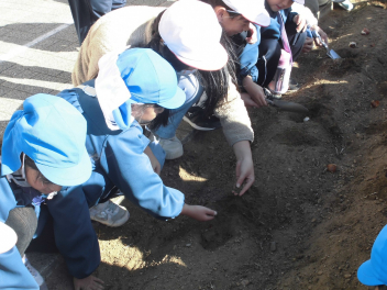 5年生は、幼稚園児と一緒に、花壇にチューリップの球根を植えました。来年、新1年生が入学するころに咲いているはずです。今から待ち遠しいですね。