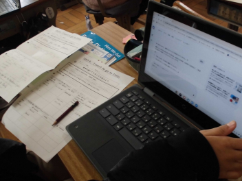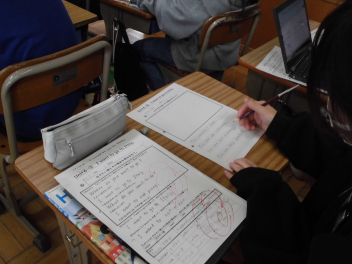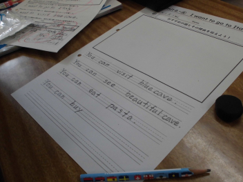 行ってみたい場所やおすすめの食べ物などを調べて、英文で表していました。