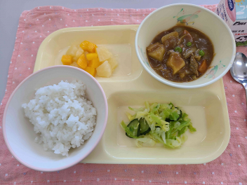 「 麦入りごはん、牛乳、ポークカレー、野菜の塩もみ、フルーツミックス 」でした。