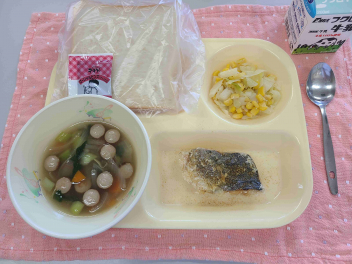 「 パン、牛乳、チョコ大豆クリーム、さわらのカレー揚げ、キャベツソテー、大麦のスープ 」でした。