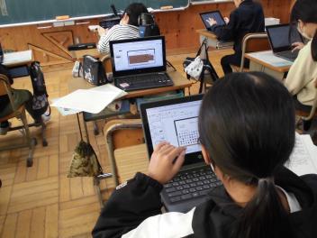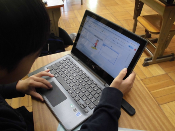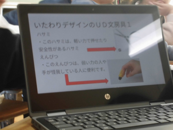 いろいろな障がいやユニバーサルデザインなど、今までに調べてきたことをプレゼンテーションにまとめています。完成したら、グループ内で発表し合います。