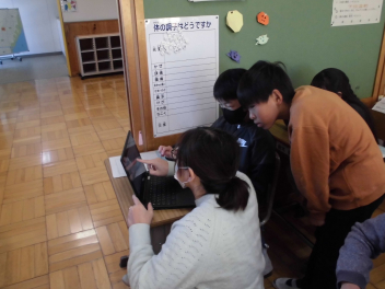 •  2年生は、学級活動で、丈夫な体を作るための工夫について学習しました。栄養教諭の先生に、野菜を摂ることの良さを聞きました。その後、グループで、苦手な野菜も食べられるようにするための工夫について話し合いました。
