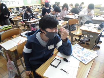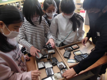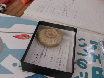 大平台小学校を建設するときに行われた地質調査のサンプルや、化石の標本などに触れながら、土地がどのようにつくられ、どのように変化してきたかを学んでいます。