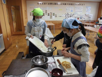 •  家庭科の学習で、洗濯の実習を行いました。洗いから脱水まで、すべて手作業で行いました。