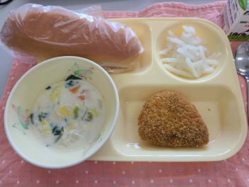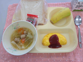 「 パン、牛乳、いちごジャム、オムレツ、野菜スープ、バナナ 」でした。