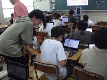 静岡大学の学生さんに教えていただき、プログラミングを学びます。命令通り動いたかな?
