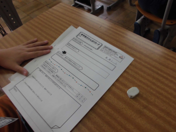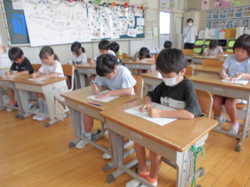 きまりのない国にいった主人公が、その世界で起こる様々な事件に、やっぱり戻りたいときまりのある自分の世界に帰ってきます。そんなお話をスライドで見た後、「きまりってどうして必要なんだろう?」を真剣に考えていた子供たちです。