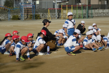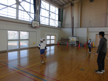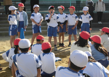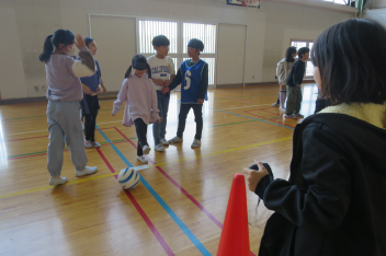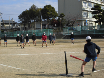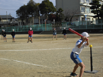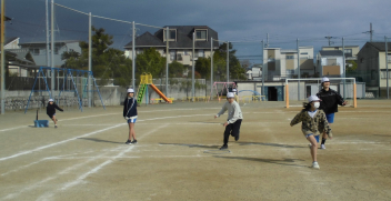 ノーパンクボールという柔らかなボールをティーの上に置き、自分のタイミングで打ちます。ベールボール型の運動で、得意な子もそうでない子も楽しめる競技です。勝敗はいかに・・・。