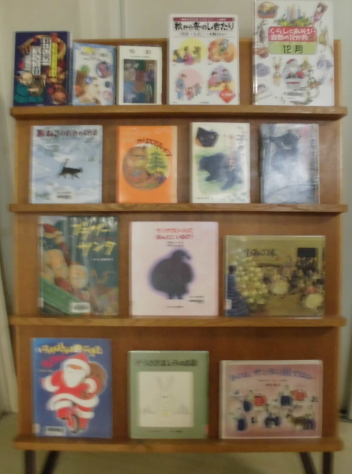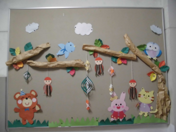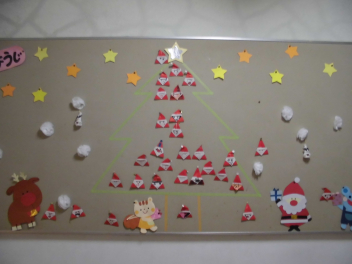 ことばの教室の前の廊下には、あわてんぼうのサンタさんがたくさん、さらに、みのむしが北風に揺られてぶ~らぶら。