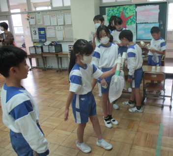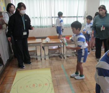種目は①ロケットポン(紙コップとビニル袋で作ったロケットを飛ばして高得点を狙います。)
