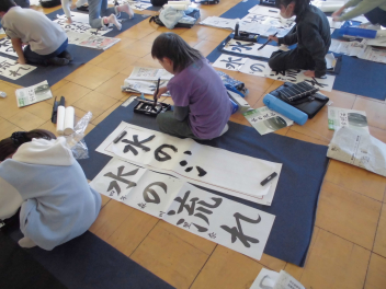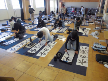 4年生が書き初めの練習をしています。太い筆で大きな書き初め用紙に一文字ずつ丁寧に書いていました。