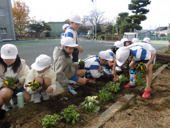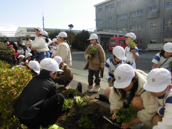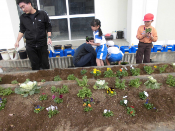 花壇に苗を植えました。2年生の子供たちと追分級の低学年の子供たちです。
