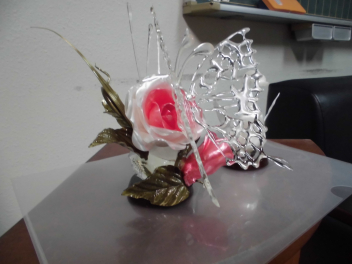 飴を細く引いたり、型で押さえたり、あるいは、空気を入れて膨らめたりして、バラの花と白鳥、そしてバラの蜜を吸う蝶々を作ってくださいました。