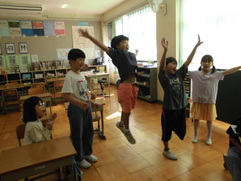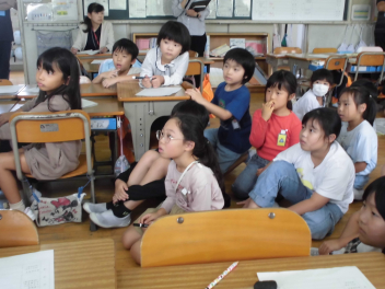 きまりのない国にいった主人公が、その世界で起こる様々な事件に、やっぱり戻りたいときまりのある自分の世界に帰ってきます。そんなお話をスライドで見た後、「きまりってどうして必要なんだろう?」を真剣に考えていた子供たちです。