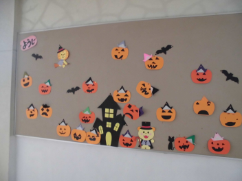 かわいらしいかぼちゃが並んでいます。ハロウィンにちなんだ楽しい掲示です。これは幼児ことばの教室に通う子供たちの作品です。発音や言葉の学習では、指先を使う活動も行います。切ったり貼ったりも大切な活動なのです。