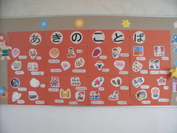 ことばの教室の前には秋の言葉がたくさん掲示されていました。語彙力は自然に増えるのを待つのではなく、いろいろな活動を関連付けて増やしていくとよいです。いろいろな表現ができるようになると話すことや書くことに自信が持てるようになりますね。