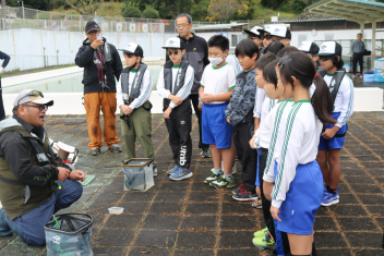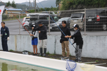 今年も4年生から6年生がニジマスの釣り体験をしたまき釣具のイシグロさんから道具をお借りして、釣り方を教えてもらったまき1年ぶりに魚釣りをする人や初めて釣りをする人もいたまきね