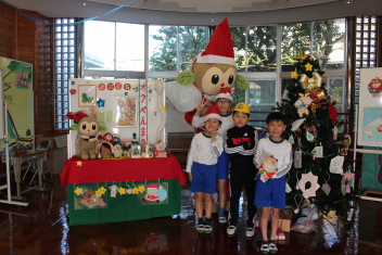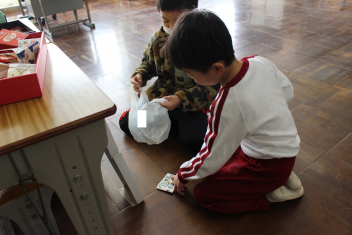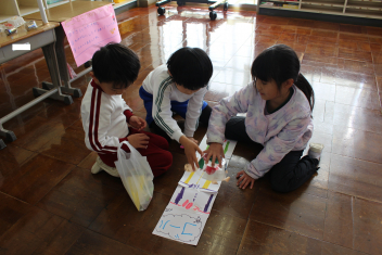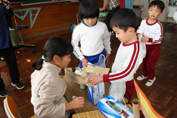 1・2年生が生活科の時間に作ったおもちゃでお店を開いていて、幼稚園生を招待し一緒に回っていたまきよ