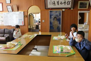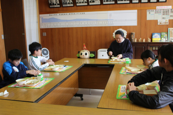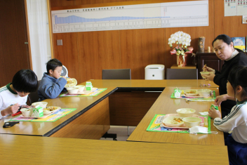 和やかな雰囲気で校長先生と楽しくお話しながら給食を食べていたまきよー!