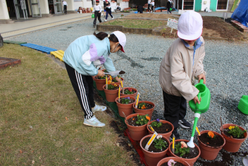 全校でパンジーの苗とチューリップの球根を植えているまき!