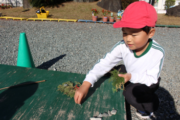 どんぐり、落ち葉、花びら、石などを使って並べてつないで工夫していたまき