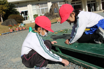 全校でパンジーの苗とチューリップの球根を植えているまき!