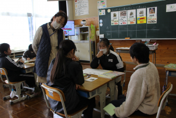 6年生は家庭科の授業で、商品を選ぶ際にどういった視点で選ぶかグループで話し合いをしていたまき