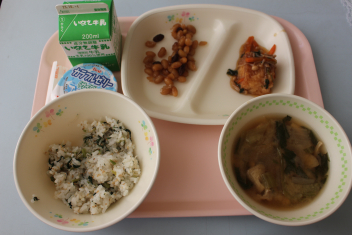献立は、こまつなごはん・牛乳・揚げ出し豆腐の野菜あんかけ・ぶどうまめ・チンゲンサイの味噌汁・サイダーゼリーまき!