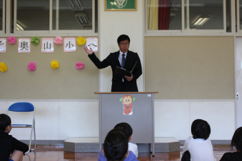 校長先生をはじめ4名の先生方が奥山小学校に来てくれたまきよー