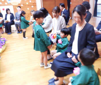 今日は年中組さんが主体となって会を進めてくれました。みんなの前で堂々と言葉を話したり、年長組さんが喜んでくれるかドキドキしたりして緊張もしていたようですが、大成功に終わり、ほっと安堵する表情や喜ぶ姿が見られました。この経験から、自信がつき、年長組への期待もより高まったと思います。