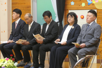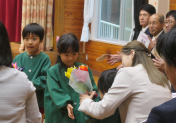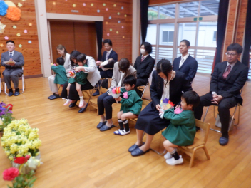 あたたかい雰囲気の中、年長ひまわり組さんの門出を、地域の方、保護者の方、たんぽぽ組さん、先生たちでお祝いをしました。