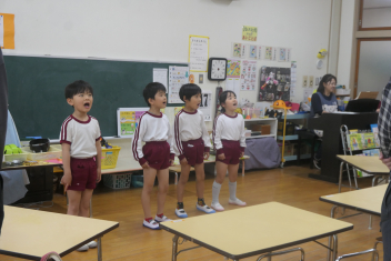 今日は年中組さんが主体となって会を進めてくれました。みんなの前で堂々と言葉を話したり、年長組さんが喜んでくれるかドキドキしたりして緊張もしていたようですが、大成功に終わり、ほっと安堵する表情や喜ぶ姿が見られました。この経験から、自信がつき、年長組への期待もより高まったと思います。