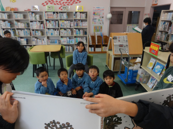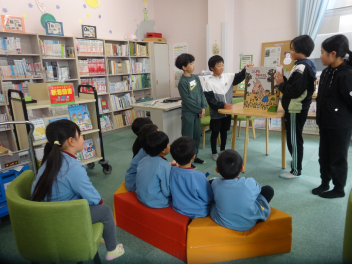 最後は図書室で、大型絵本を使って「読み聞かせ」