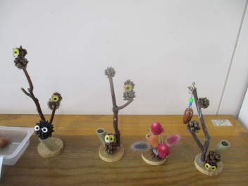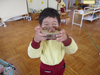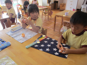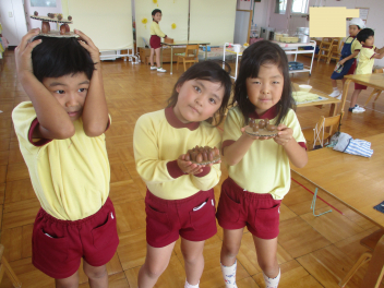 年少さんは、「どんぐり」を製作しました。のりを上手に使うことができるようになってきました