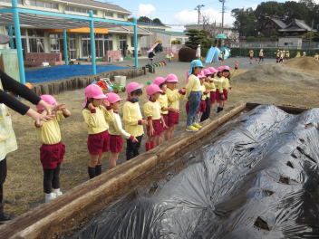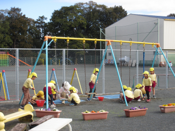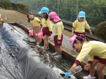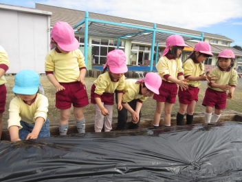 年少さん、年中さんは「大きくなってね」と願いを込めて、じゃがいもを植えました