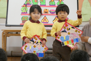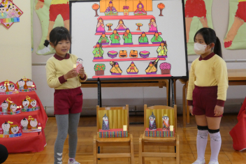 年長、年中、年少さんの代表園児は、自分たちが作ったおひな様について、作り方や頑張ったことを発表しました