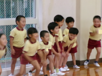 リレーをしている年長さんを見て、年中さんは「自分たちもやりたい!」と、リレーに挑戦しました