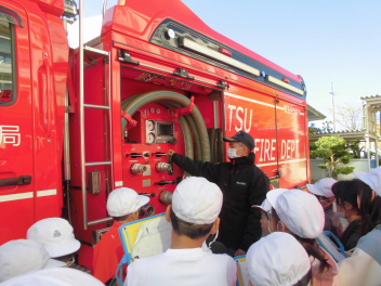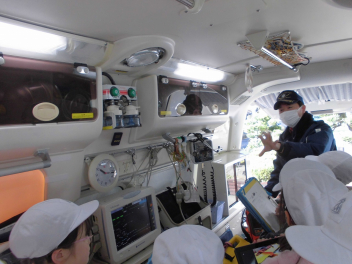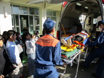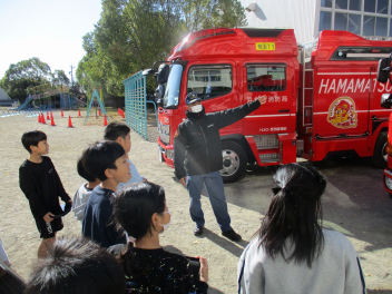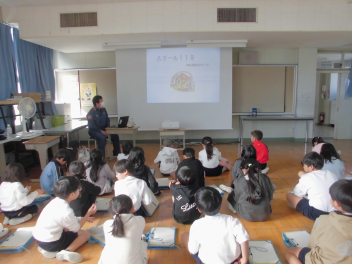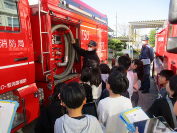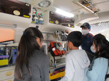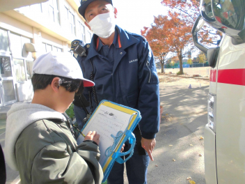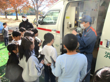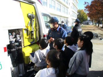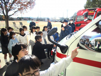 • 11月26日、3年生がスクール119を行いました。救急車、消防車、レスキュー車が昇降口に大集合。消防署員さんのお話を聞いたり、実物を見たり触ったりして、くらしを守る仕組みを学びました。