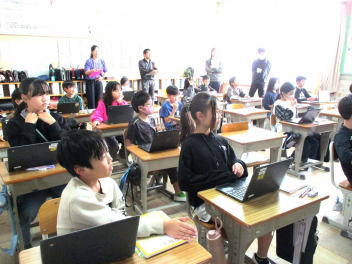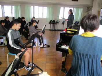 • 12月1月の6年1組の音楽の様子です。滝廉太郎作曲の「花」「荒城の月」「箱根八里」の鑑賞の授業でした。まず、歌詞から、どんな曲想なのか想像をしました。その後、実際に3曲の鑑賞をしました。いつもなら、CDや映像で鑑賞をしますが、この日は、生歌・生演奏で聴きました! 歌が得意な先生とピアノが得意な先生が目の前で演奏をするのを、子供たちとはうっとりと聴き入っていました。
