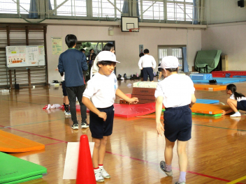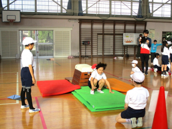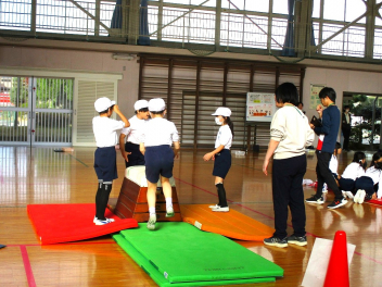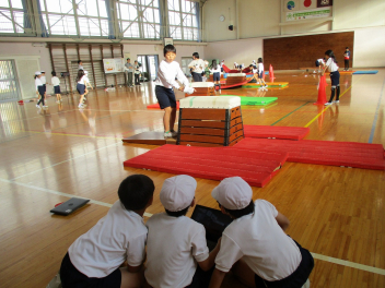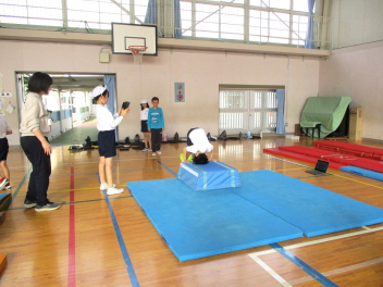 • 12月1月の3年2組の体育「笑顔でクリア!跳び箱チャレンジ」の様子です。この日は、台上前転に取り組んでいました。子供たちは自分の課題に合った場所や練習の仕方を選んで練習を重ねました。また、友達とアドバイスをし合いました。踏み切り、回転、着地など、見る視点を役割分担してアドバイスをしたり、タブレットで録画した動きを見ながらアドバイスをもらったりしました。練習前と後では、動きがレベルアップした子がたくさんいました。