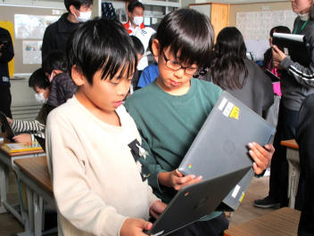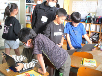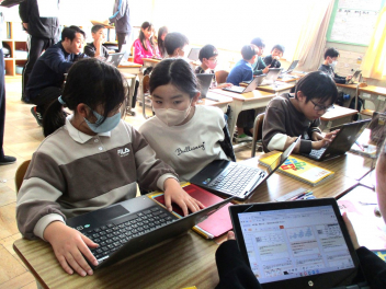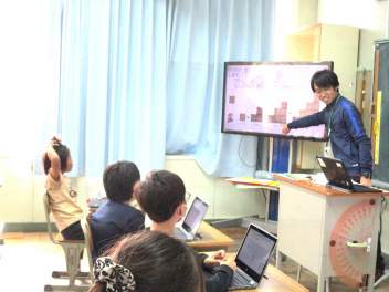 • 12月8日の、4年1組の算数「変化のきまりを見つけよう『変わり方』」の様子です。階段のように並んだブロックの段の数と周りの長さとの関係を考える時間でした。図、表、グラフ、計算など、思い思いの方法で関係を導き出してしました。タブレット上の「みんなのボード」を見て、自分と同じ考えの友達がいることで自信をもったり、自分とは異なる多様な考え方を知って考えを広げたりする姿が見られました。