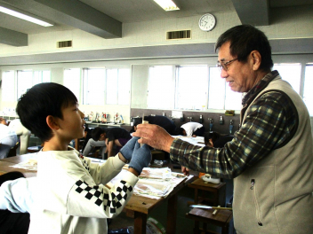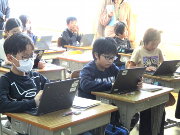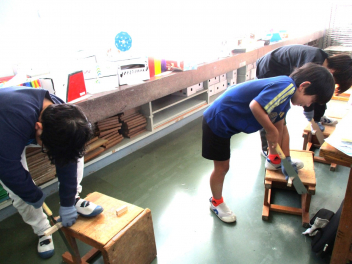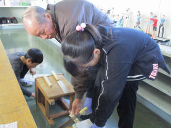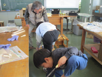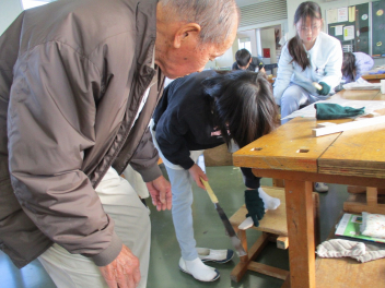 • 12月16日の4年2組の図工の様子です。のこぎりを使って木を切っていました。この日は、CSから2人の学習ボランティアさんが支援をしてくださいました。木の固定の仕方やのこぎりの挽き方について丁寧に教えてくださいました。12月は全部で3回お手伝いをしていただきます。