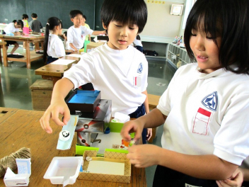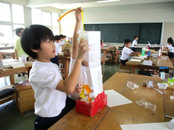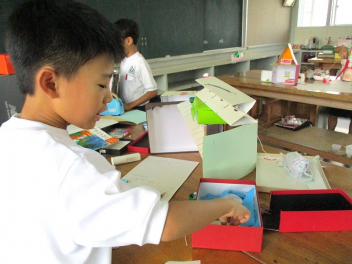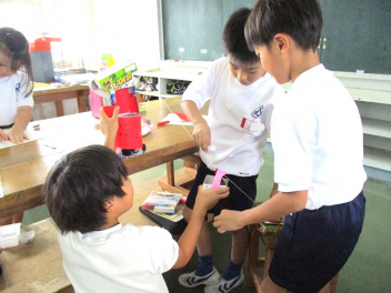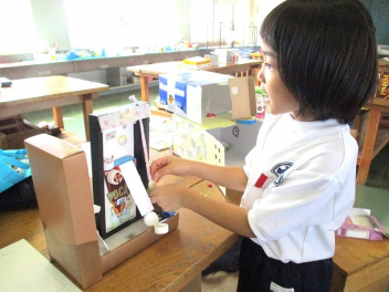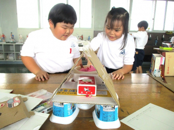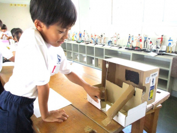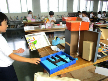 • 10月17日の、2年1組の図工「ともだちハウス」の様子です。家から持ってきた箱を組み合わせて、「小さなともだちが喜ぶ家」を作りました。建物の中には、台所やお風呂、花瓶やベッドなどがあります。プールや映画館、ドームがある建物もあります。科学者の家には実験器具もありました。この時間は、小さなともだち(小石・貝殻・ペットボトルの蓋など)を連れて、出来上がったともだちの建物に遊びに行く「建物探訪」をしていました。様々な仕掛けを楽しむ中で、発想の面白さや細かい細工に気付きました。