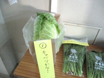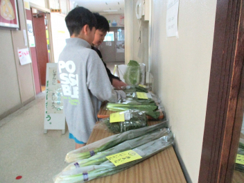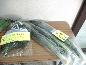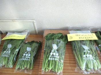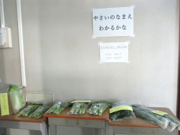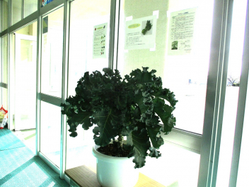 職員室前には、緑の野菜が並んでいます。野菜の名前が正しく言えるかな。子供たちは、実際に手に取って、重さやにおいなどを感じています。昇降口には、プチヴェールの鉢植えが展示されています。葉を茹でると鮮やか緑色になり、とてもおいしいです。