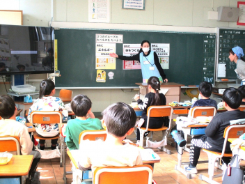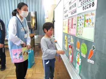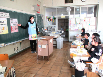 • 1月27・28日の2日間、給食の時間に、積志小学校の栄養教諭の野間先生に御来校いただき、2年生に食育のお話をしていただきました。その日のメニューに使われている食材のカードがお腹のポケットから出てくると、子供たちは大盛り上がり。その食材が、黄・赤・緑のどのグループに入るのか当てながら、どんな働きがあるのか知ることができました。2年生は残食がとても少ないです。これからも、バランスよく、モリモリ食べてほしいと思います。