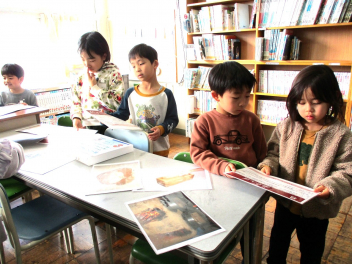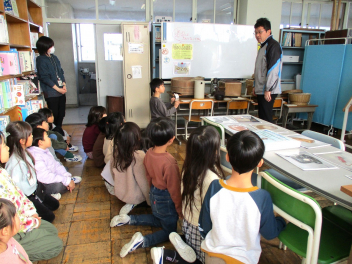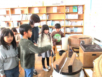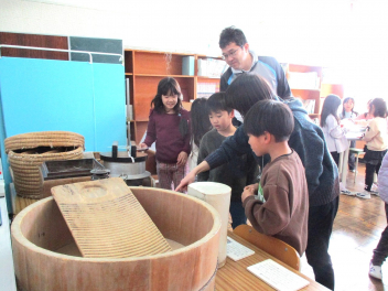 • 1月27~29日の3日間、大瀬小学習室に移動博物館の展示をしました。1月28日は、1年生が展示を見に来ていました。今回のテーマは、「昔のくらしの道具」です。実物や写真を物珍しそうに見ていました。期間中、全学年の子供たちが授業や休み時間に展示を見に来ていました。