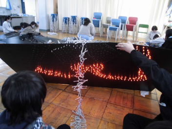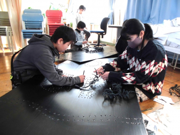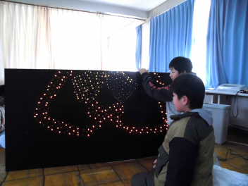 図案を決める→下書きをする→線上にキリで穴をあける→指定の色のLEDをはめる いう作業工程を一つ一つ丁寧に行っています。途中で通電し、どんな感じに仕上がりつつあるか確かめながら準備を進めています。完成が待ち遠しいですね。