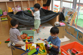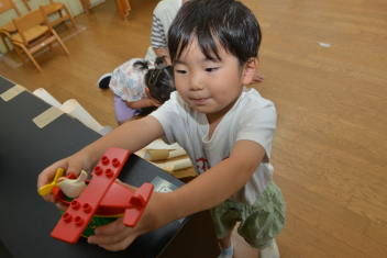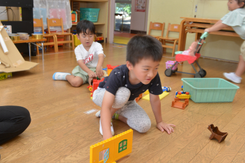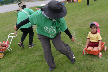 カードに書いてある動物に変身して(例:コアラならば、おんぶする)移動し、乗り物にこどもを乗せてゴールする内容です